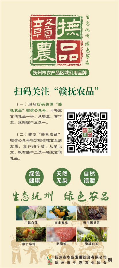 在活動現場掃碼關注“贛撫農品”微信公眾號和轉發“贛撫農品”微信公眾號指定推文至朋友圈集齊38個贊,還可獲得徽章、簽字筆、冰箱貼、筆記本、帆布袋等精美的文創禮品。