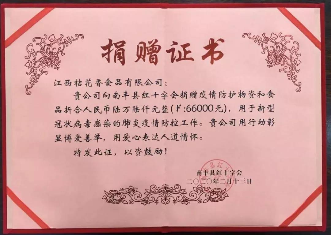 為積極做好疫情防控工作,近日,撫州市生態(tài)農(nóng)業(yè)協(xié)會副會長單位江西桔花香食品有限公司向南豐縣紅十字會捐贈了價值66000元的防護(hù)物資和食品,用于新冠肺炎疫情防控工作。